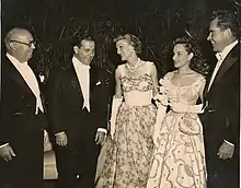 Due to the impossibility of assuming the position as a bachelor, Goulart had to get married. However, Maria Thereza, then 17, felt insecure and took a while to accept the idea, which was already arranged.[76] The civil ceremony took place on 14 May 1955, but it was by proxy, as a storm prevented Goulart's plane from arriving.[77] Four days later the religious wedding took place, followed by a short honeymoon due to the campaign.[78]