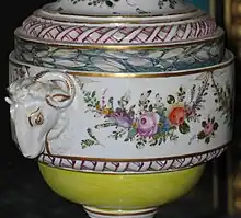 De Mol began with experiments in his garden shed behind the parsonage, opposite the church in Oud-Loosdrecht. In 1774, he started producing porcelain as a way of creating employments for the local population in the impoverished peat district. A part of the production process, however, was sited in Bilthoven.[1] On a country estate, property of the youngest brother of Belle van Zuylen, stood a "pletmolen met stamperij" (mill with grinding facilities), where feldspar, but possibly also cheap Chinese porcelain was added and ground up. The raw materials were mixed up with suitable white clay (from England?) and quartz in a cellar in Utrecht, and shipped to Oud-Loosdrecht.