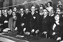 In the Cortes[153] initially Beunza adopted a moderate posture. During his inaugural address in late July he admitted that the Catalan issue appeared more urgent than the Basque one and did not press the cause of autonomous statute. He merely asked that the regular ayuntamientos – in early days of the Republic replaced by appointed comisiones gestoras, the move he considered somehow justified given threat of revolutionary violence – be restored now that the situation stabilized.[154] Beunza did not advance anti-Republican propaganda, though in August in name of Minoría Vasco-Navarra he voiced against exaltation of pro-republican Jaca rebels, executed during last days of the monarchy.[155] In September 1931 – once Estatuto de Estella has been finalised – together with the nationalist leader José Antonio Aguirre and during a solemn ceremony, accompanied by some 400 alcaldes from Basque-Navarrese municipios, he handed the autonomy statute proposal to the then prime minister, Niceto Alcala-Zamora.[156]