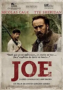 Joe is a 2013 American independent Southern Gothic crime drama film directed and co-produced by David Gordon Green, co-produced by Lisa Muskat, Derrick Tseng and Christopher Woodrow and written by Gary Hawkins, based on Larry Brown's 1991 novel of the same name. It stars Nicolas Cage and Tye Sheridan, revolving around a tormented man who hires a 15-year-old boy and protects him from his abusive father.