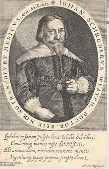 Johann Schröder (1600, Bad Salzuflen – 1664) was a German physician and pharmacologist who was the first person to recognise that arsenic was an element. In 1649, he produced the elemental form of arsenic by heating its oxide, and published two methods for its preparation.[1]