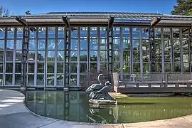 The garden-and-greenhouse occupied 5 acres (2.0 ha) which contained both exotic and native plants. Greenhouse sections included the main conservatory, a tropical conservatory, a sculpture garden with the "Dove of Peace" carrara marble sculpture, a fern grotto, a sub-Mediterranean conservatory and an outdoor garden. "Partners in Time" is a 22-foot indoor waterfall, over which 350 gallons of water flowed per minute.[4] Indoor displays were changed eight times each year and bronze sculptures added to the visitor's experience.[5]
