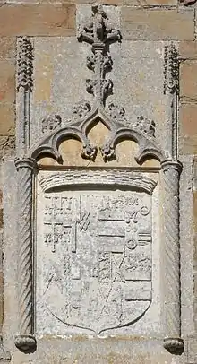 Arms of Bourchier impaling Manners, sculpted above door to south chancel aisle, built by the 2nd Earl, Tawstock Church. Representing arms of John Bourchier, 2nd Earl of Bath (1499 – 1560/61) (with 10 quarterings) impaling Manners (with 4 quarterings), for his second wife Eleanor Manners, daughter of George Manners, 11th Baron de Ros (c. 1470 – 1513)