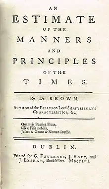 Brown's major popular success was the Estimate of the Manners and Principles of the Times (2 vols., 1757–1758), a bitter satire. It struck a chord after the Battle of Minorca (1756), a British reverse at the outset of the Seven Years' War.[1] Edmund Burke, in a review for The Annual Register for 1758, rejected Brown's analysis as far as it depended on charges of "effeminacy" in the British nation and aesthetic.[12] Thomas Sheridan believed the fundamental issue was selfishness, and the solution better oratory.[13]