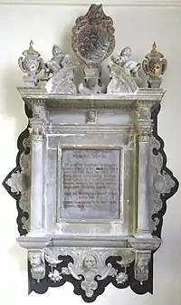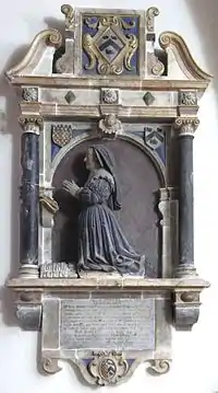 • Firstly to Ursula Strode (d.1635), daughter of Sir William Strode (d.1637), MP, of Newnham, Plympton St Mary, whose monument in Plympton St Mary's Church shows his effigy with that of his two wives and ten children. Her brother was the parliamentarian William Strode (1594-1645), one of the Five Members whose attempted arrest in the House of Commons of England by King Charles I in 1642 sparked the Civil War. Ursula's mural monument exists in Bishops Tawton Church, showing her effigy kneeling at a prie dieu with two babies side-by-side wrapped in swaddling clothes in front of her. At the top within an elaborate gilded frame within a broken pediment is a lozenge showing the arms of Strode: Argent, a chevron between three conies courant sable.[2] On the arch above her is shown on the dexter the arms of Chichester and on the sinister the arms of Strode. Below underneath an inscribed tablet is a cartouche bearing the arms of Chichester impaling Strode. The tablet is inscribed as follows:
