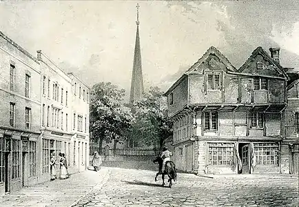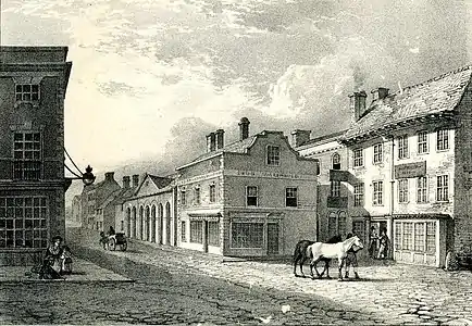 John Chubb's topographical work shows Bridgwater streets and buildings, and his portraits are of his family and local worthies. A number of the paintings feature pretty girls in ornate hats.[24] His portraits of tradesmen and craftsmen include their tools, rather like the Books of Trades of earlier centuries. There are more portraits than topographical paintings. Some time in the early C19 lithographic prints were made of about a dozen of his paintings of Bridgwater scenes, and these are fully represented in the Museum's collection. They were probably by his grandson, John Chubb the younger, also a talented artist. A letter (in the Chubb MS in the Somerset Record Office) which he wrote to his father, Morley, in 1835, mentions him having drawings reproduced as prints by Charles Joseph Hullmandel, the foremost lithographic printer of the time.