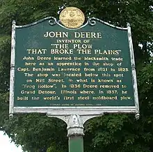John Deere settled in Grand Detour, Illinois. At the time, Deere had no difficulty finding work due to a lack of blacksmiths working in the area.[13] Deere found that cast-iron plows were not working very well in the tough prairie soil of Illinois and remembered the needles he had previously polished by running them through sand as he grew up in his father's tailor shop in Rutland.[13] Deere came to the conclusion that a plow made out of highly polished steel and a correctly shaped moldboard (the self-scouring steel plow) would be better able to handle the soil conditions of the prairie, especially its sticky clay.[14]