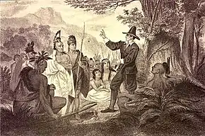 The chief barrier to preaching to the American Indians was language.[8] Gestures and pidgin English were used for trade but could not be used to convey a sermon. John Eliot began to study the Massachusett or Wampanoag language, which was the language of the local Indians.[10] To help him with this task, Eliot relied on a young Indian[3] named "Cockenoe".[11][10] Cockenoe had been captured in the Pequot War of 1637[12] and became a servant of an Englishman named Richard Collicott.[10][13] John Eliot said, "he was the first that I made use of to teach me words, and to be my interpreter."[10] Cockenoe could not write but he could speak Massachusett and English. With his help, Eliot was able to translate the Ten Commandments, the Lord's Prayer and other scriptures and prayers.[10]