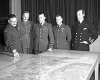 After promotion to acting air commodore—a rank precluded from operational flying—he was Mentioned in Dispatches in December 1944.[10] He then voluntarily reverted to group captain so that he might begin a third tour of operations, this time as commanding officer of No. 617 Squadron RAF (the Dambusters squadron), which he led from December until the end of the war.[11] Under his command the Dambusters conducted raids against submarine pens, viaducts and other targets.[12]