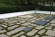 The final design was unveiled publicly at the National Gallery of Art in Washington, D.C., on November 13, 1964.[9] Secretary of Defense Robert McNamara unveiled the design, with Kennedy's brother, Robert F. Kennedy, and sister, Eunice Kennedy Shriver, in attendance.[9] The final design had won the approval of the Kennedy family, the Department of Defense, the U.S. Commission on Fine Arts, and the National Capital Planning Commission.[9][40] Two overarching design concerns guided the design of the site. First, Warnecke intended the grave itself to reflect the early New England tradition of a simple ledger stone set flat in the ground surrounded by grass.[9] Second, the site was designed to reflect Kennedy's Catholicism.[9] As originally envisioned, a circular granite walkway was envisioned which would create two approaches to the grave site.[43][44] The walkways were intended to overcome the steep 45-degree incline of the hill up to the burial plot.[9][40] Kennedy was buried so that his grave faced northeast toward the Washington Monument. The entrance to the circular walkway was from the southeast, which created a southern, shorter leg of the circular walkway. Warnecke intended for this shorter walkway to be used by family members and dignitaries who were making private visits to the grave, while the longer walkway would not only separate the public from these VIPs but also accommodate the long lines of people wishing to pay their respects.[9] A small elliptical plaza (120 feet (37 m) long and 50 feet (15 m) wide) made of marble was set at the top of and inside the circle.[43][44][45] The northeastern side of the elliptical plaza would be enclosed by a low wall inscribed with quotes from Kennedy's speeches.[43][44] Marble steps would lead up from the plaza to a rectangular terrace 66 feet (20 m) long and 42 feet (13 m) wide.[43][44][45] Flowering magnolia trees would be planted on either side of the steps up to the terrace.[9] Centered in the terrace would be a rectangular plot of grass 30 feet (9.1 m) long and 18 feet (5.5 m) wide, raised slightly above the ground level, which would accommodate the graves.[9][43][44][45] Flat black ledger stones (3 feet (0.91 m) by 4.53 feet (1.38 m)) would mark each grave, listing the name and date of birth and death in raised lettering.[9] The ledger stone would be set flush with the earth.[43][44] A 7.5 feet (2.3 m) high and 36 feet (11 m) long retaining wall, inscribed with the presidential seal, formed the rear of the burial site.[43][44][46] The walkways, elliptical plaza, and terrace were designed to accommodate more than 50,000 visitors per day.[9] The eternal flame itself would be placed in the center of the grassy plot in a flat, triangular bronze sculpture intended to resemble a votive candle or brazier.[9][43][44] Rachel Lambert Mellon was employed to landscape the approaches with flowering trees (magnolia, cherry, and hawthorn).[47] At the time of the design's unveiling, the quotations for the low wall had not yet been selected by Mrs. Kennedy.[9] The original design won near-universal praise.[48]