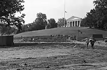 Construction of the approaches required regrading the hill. Crews were forced to work with picks and shovels around the oak tree to protect its roots while engaged in regrading work.[55] The tree's roots were reinforced with concrete to provide stability to the plant, and a "breathing system" incorporated into the concrete to allow the roots to still secure nourishment.[55] Twenty tons of steel were used to build the terrace, and 280 tons of concrete poured to build the grave vaults and the eternal flame site.[55] The first fieldstones for the graves were placed April 11, 1966.[45] At the same time, the ground was prepared for the emplacement of the granite blocks which would form the low memorial wall on the downslope side of the elliptical plaza.[45] Jacqueline Kennedy, with assistance of Kennedy speechwriter Ted Sorensen, selected the inscriptions for the wall by November 1965, all of which came from Kennedy's inaugural 1961 address (although some were shortened for artistic reasons).[45][55] John E. Benson inscribed the quotations onto the seven granite blocks.[45][47] The lettering is in Roman majuscule.[56] In November 1965, the contractors estimated that the site would be finished by July 1966.[53] The government announced that the bodies of Kennedy, Patrick and Arabella would be reburied in a private ceremony at night after the cemetery had closed on the day before the site was opened to the public.[53][55] For a time in the fall of 1966, the Army considered floodlighting the site to permit night-time ceremonies, but this plan was quickly discarded.[57] In mid-October 1966, design changes and construction delays had forced the opening of the new burial site to early 1967.[58]