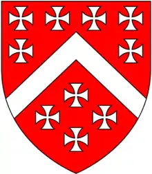 Arms of Berkeley: Gules, a chevron between ten crosses pattée six in chief and four in base argent
