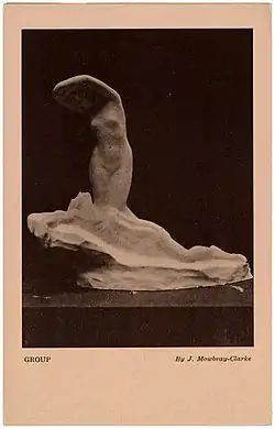 In 1919, the Kevorkian Gallery in New York City published an exhibition catalog of Mowbray-Clarke's work, which includes reproductions of his sculpture and medals.[10] The catalog lists a total of seventy-three works, and reveals a radical evolution in Mowbray-Clarke's style during the nineteen-teens. Early works were executed in a small scale and had a rough finish, in a manner that "emphasized the artist's hand." By contrast, later sculptures such as Broadway, c. 1919–which the artist intended to be 40 feet high and ideally stand in Times Square–were executed on a monumental scale, and featured a smooth and refined finish.[5] According to the critical essays in the catalog, Mowbray-Clarke is depicted as an idealistic individualist, whose work offers metaphoric social and political commentary; topics of his sculptures included satirical critiques of capitalism, militarism, and other aspects of Western society.[5]