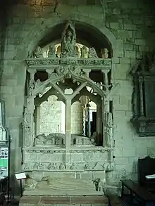 Monument and effigies of John Harington, 1st Baron Harington (died 1347) and his wife,[2] Cartmel Priory. A 1646 drawing of it by Daniel King showed the arms of Dacre on the monument[3]