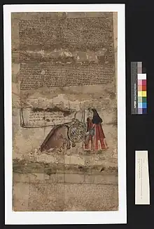 John the Younger participated alongside Duke John III of Bavaria in the Siege of Dordrecht against Duke John IV of Brabant and Countess Jacqueline of Holland in 1418.[19][note 13] Because John the Younger had the luck on his side, John III of Bavaria's army was victorious. For this military service, John III of Bavaria owed John the Younger 5,000 guilders, which, in a debenture, he promised to pay in Arnhem on 25 July 1419.[19] However, John III of Bavaria did not pay his debt.[4][19] After a complaint to a vehmic court in Westphalia was unsuccessful,[19] John the Younger resorted to a swearing letter which he sent to several noble courts. This swearing letter disgraced John III of Bavaria as a word-breaker and non-payer of his debts.[4][19] The letter includes a drawing that closely resembles a present cartoon in which John III of Bavaria is depicted holding up a pig by its curly tail and pressing his seal stamp on the pig's buttocks with the other hand. The accompanying text reads:[19]