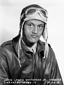 John Lyman Whitehead Jr. was born in Lawrenceville, Virginia, on 14 May 1924. His father, John Lyman Whitehead Sr, was a 1916 Yale graduate who served as the Business Manager and Treasurer at the now-defunct Saint Paul's College.[1] In 1942, he found work as a line boy at Charleston Airport. He joined the Enlisted Reserve Corps in 1942, and enlisted in the United States Army Air Corps the following year, when he reached the minimum age of 19 during World War II. He was selected for training as a pilot, and sent to Tuskegee Army Air Field in Alabama, where he became one of the Tuskegee airmen. He earned his wings on 8 September 1944, and was commissioned as a second lieutenant.[2]