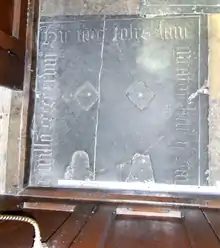 He was buried at the east end of his Chapel, where survives his ledgerstone, in the middle of the aisle and now mostly covered by box-pews and missing the monumental brasses of which only the matrices remain, in the shapes of a man and a woman, wearing a headdress, facing each other, the man on the left and his wife on the right, with two lozenge-shaped heraldic shields above, also missing their brasses. The heads of the figures face the west-end of the Chapel. The ledger line is inscribed in Latin as follows:[10]