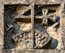 Merchant's mark of John Lane, sculpted on exterior of the Lane Aisle of Cullompton Church, showing the mystical "Sign of Four" the stem of which is formed of a teasel frame used for carding wool. The emblem is repeated profusely on corbels and ceiling bosses inside the chapel