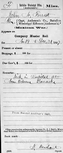John N. Forrest was 19 years old when he enlisted as a volunteer soldier in what became Company C of Anderson's Rifles (also known as the Mississippi Battalion), on October 30, 1847, at Hernando, the county seat of DeSoto County, Mississippi.[1] J. Patton Anderson recruited and organized Company C, also known as the De Soto Volunteers; when Anderson was elevated to lieutenant-colonel in February 1848, Hilliard P. Dorsey took over as company captain.[2][3][4][5][6] Anderson's Battalion makes but a vanishing appearance in the military and cultural history of the conflict.[7][8] According to the Mississippi Encyclopedia, "The 2nd Mississippi Rifles and Anderson's Battalion of Mississippi Rifles were raised as the result of later federal calls for troops. Neither unit participated in major combat operations...Anderson's Battalion of Mississippi Rifles mustered into service at Vicksburg in September 1847 with 445 men, spent most of its war service in garrison at Tampico, and mustered out of service at Vicksburg in July 1848 with 342 men. It suffered no battle deaths and lost 38 men to other causes."[9]
