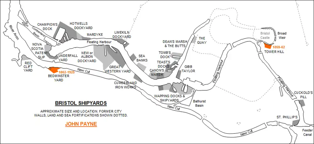 In around 1850, John Payne established himself as a millwright, engineer, iron founder and steam boiler maker, inland from the River Avon at Tower Hill in Bristol.[1] In 1859, he branched out into shipbuilding, a natural expansion of his marine business, firstly completing the Jane, a small wooden steam tug. This had to be launched into Bristol Harbour after transportation by truck, and she was used by the company to tow barges with machinery from the wharf near the workshops. Her small size once enabled her to save the crew of a stricken barque in Bristol Harbour. The company built three wooden tugs at Tower Hill, likely including the diminutive 11 t Merrimac,[2] and later built up the towing fleet over a number of years.
