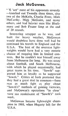 Another source of income for McGowan when not boxing was appearing and touring with the Bland Holt Dramatic Company. He would take part in novelty sporting exhibitions which were written into the plays. In Sporting Life he gave demonstrations of scientific boxing with another lightweight, played on at least one occasion by his brother Archibald McGowan, an amateur lightweight champion himself.[2][3][4]