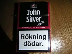 ![]() An old Swedish pack of John Silver cigarettes, with a Swedish text warning at the bottom of the pack. | |
