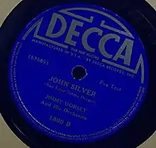 Jimmy Dorsey and His Orchestra recorded "John Silver" on April 29, 1938, and released the song as a Decca 78, 3334A, Matrix # 63689, with Bob Eberly on vocals.[1] The single reached no. 13 on Billboard in 1938, staying on the charts for 2 weeks.[2]