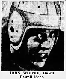 John Albert "Socko" Wiethe (October 17, 1912 – May 3, 1989) was an early all-around sports star in football, baseball and basketball. He played professional American football guard/linebacker in the National Football League. He played four seasons for the Detroit Lions (1939–1942). He also briefly played in the National Basketball League during the late 1930s, and also played independent pro baseball. He later coached both football and then basketball at the University of Cincinnati. In later years, he was also active in local Cincinnati politics as a Democrat.