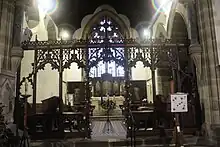 This is a Grade I listed building, founded in the 12th or 13th century.[28] Costing £4,400 (equivalent to £414,774 in 2021),[14][29] It was restored to designs by architect John Wilson Walton,[nb 8][30][31] and re-opened and consecrated by the Bishop of Ripon, on 16 October 1873, after three hundred years of neglect.[32] Walton-Wilson added a chancel, a vestry and an organ chamber.[33] The restoration cost over £4,000 (equivalent to £377,067 in 2021).[14][32] The reredos and pulpit were executed by Robert Beall.[32]