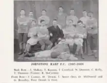 During the 1884–85 season, the two senior clubs in Johnstone, Johnstone F.C. and Johnstone Rovers, agreed to merge.[2] Rovers had a number of players with Irish roots, and, given the merged club had taken on Johnstone's colours and ground, there may have been some dissatisfaction, as for the 1886–87 the Irish community in Johnstone formed a new club, the Harp. Whereas the merged Johnstone club only had 82 to 86 members in 1886, the Harp started out with 100.[3]