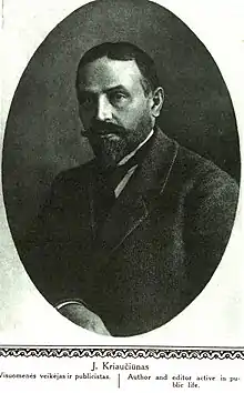 Kriaučiūnas was a member of the Lithuanian Mutual Aid Society of Vilnius.[2] During the Russian Revolution of 1905, Kriaučiūnas and Jonas Basanavičius raised the idea of organizing the Great Seimas of Vilnius which took place in December 1905. It was an important event in the development of the political Lithuanian national consciousness.[10] Kriaučiūnas was elected to the board of the National Democrats Party (Tautiškoji demokratų partija) which was established right after the Great Seimas.[2] In 1907, he published a Polish brochure on the Lithuania–Poland relations.[1] He was particularly critical of Poles earning himself a label of Polonophobe.[3]