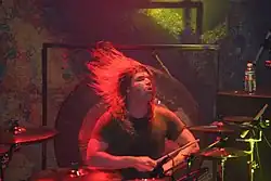 When Lambesis plotted to kill his wife, Mancino, along with AILD's guitarists Phil Sgrosso and Nick Hipa and bassist Josh Gilbert formed a new band called Wovenwar with Shane Blay, Oh, Sleeper's guitarist and vocalist.[9] Mancino recently stated that there is no ill will towards Lambesis.[10] Wovenwar has released two albums, Wovenwar (2014) and Honor Is Dead (2016). In 2016, Mancino filled in for Unearth drummer Nick Pierce for a brief time.[11][12] Mancino has released several play-through videos, including "Anodyne Sea".[13] In 2017, it was reported that Lambesis resurrected AILD with all new members. It was also stated that none of the original members, including Mancino, would return to the lineup.[14][15] However, in June 2018, it was confirmed the lineup of Mancino, Hipa, Sgrosso, Gilbert and Lambesis have reunited.[16] Mancino left As I Lay Dying in 2022.