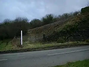 Jordanston Halt, situated between Letterston Junction and Fishguard & Goodwick 284 miles 8 chains (457.2 km) from Paddington (measured via Rosebush), opened on 1 October 1923.[3][4] The halt was close to the top of a 1 in 100 gradient sloping down towards Letterston Junction.[5] Initially there were two platforms, but the double line north of Letterston Junction was singled on 9 March 1958 and the former up platform then served both directions. The facilities were basic: the platform surface was of cinders no higher than the rails - portable steps were used to board trains; and there was a small wooden shelter.[6][7]
