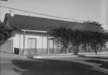 The Abrego home built in 1834 is privately owned today. It was designed by Don Estevan de la Torre, brother of Joaquin de la Torre, formerly alcalde of Monterey and secretary to Governor Pablo Vicente de Solá.[39][9] Native Americans were hired to build the adobe.[39] It is a single-story adobe and wood structure. The upper gables are wood. It has French doors, six-over-six windows, and a full-length, narrow porch with a balustrade on the front of the building.[40] Portions of the home were used as a store during its early years.[39] It was assessed in 1851 for a value of $200, and in 1855 for $400.[16]