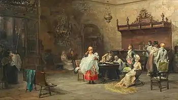 Among his notable paintings may be mentioned; The Magician, sold at a raffle to benefit the victims of a flood in Murcia, and The Father of the Poor, which was featured at an exhibition of the Círculo. His principal work is now considered to be the one from the exhibition of 1881, which represented a sacristy where a baptism and a funeral service are being held simultaneously.[1]