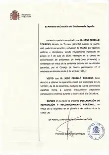 Moral reparation and personal recognition of José Perelló Torrens (A)