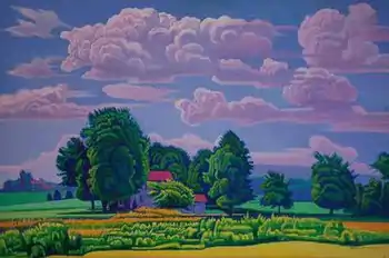 Throughout his career Plavcan was continually committed to color, though his work itself ranges from the realistic to the highly stylized.[18] With the development of acrylic paints in the 1960s, Plavcan turned away from his earlier representational style and began experimenting with a hard-edged geometric style.[19] These later paintings incorporate vibrant, unblended colors and were inspired by the work of his own student, Op-artist Richard Anuszkiewicz.[20] Plavcan continued to develop this style until the end of his life, ultimately settling on a more subtle approach that used the same bright colors but softer edges.[21] On the evolution of his art, Plavcan stated, "I don’t think that I have gone back to my earlier style. It is a building process, not necessarily regression. It is very hard once you’ve learned additional information to not use that in your art."[22]