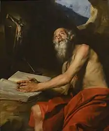 In 1667, he received a commission to create four large canvases on the Passion of Christ for the chapel of the Christ of Sorrows of the Third Order of Saint Francis, for which he would be paid 1,550 reales each. They were completed the following year and constitute the only full set of works he is known to have produced.[2] They show the influence of Flemish art. Six smaller works in the sacristy were attributed to him by the art historian, Antonio Palomino, but this has been questioned. He also executed three canvases in collaboration with José Jiménez Donoso. It is likely that he also painted some frescoes, although none have survived.[3] An oil painting of the Pentecost is preserved at the Abbey of Santo Domingo de Silos.