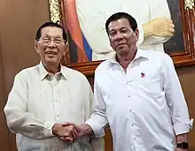Enrile quietly bowed out of politics after his term in the Senate ended in 2016, but tried to make a comeback in 2019. He placed 22nd in a field of 62 candidates.[49] In 2022 he officially returned as government as Chief Presidential Legal Counsel in the administration of President Bongbong Marcos, whom he supported for president in elections that year. He played a role in forcing the resignation of Marcos' Executive Secretary Vic Rodriguez on September 17 by rejecting the latter's appointing of himself as Presidential Chief of Staff with extensive powers.[50]