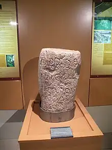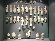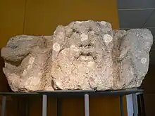 Excavations have uncovered many fragmentary offerings: Celtic offerings followed by bronze items whose purpose was exclusively votive.[59] The inner construction used local stone, while shelly limestone from the Loire was used to dress the exterior walls.[57] The columns of the peribolos were cut from grès quarried a dozen kilometers away,[27] while the capitals were tuffeau stone. Decorative elements from the sanctuary are now exhibited in the museum, including the head of a mother-goddess statue in shelly limestone.[60] Fragments of frescoes have also been found; one of them represents a pigeon and decorated one of the entrances to the peribolos.[61]