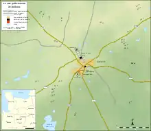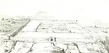 Archeologists found the necropolis of the city, which makes it possible to place in a rather definite way the limits of the city's influence. However, traces of organization beyond its western limits have raised doubt, although archaeologists have cautiously considered these traces related to a centuriation of the surrounding countryside.[25] According to Jacques Naveau, "the main feature of this plan is the alignment of public buildings along a north-south axis, which seems central" over a length of 800 meters.[25][24] He also links this alignment to the religious origin of the city.[26]