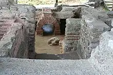 Inside the enclosure are the remains of two thermal complexes, one to the northeast and the other to the southwest. The "small baths" are very simple with two rooms, one of which is on hypocaust and the other serves as a changing room and boiler room.[44] The "great thermal baths" of twelve by six meters have the main rooms of a bathhouse:[46] vestibule, frigidarium, three rooms on hypocaust (including a warm room and an oven) and a boiler room.[44]