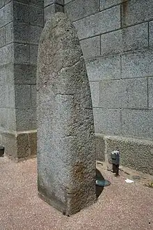 The construction was of a type frequently used in Gaul, combining stone with extensive use of wood. Using a natural slope of the ground, the bleachers were built in the latter material.[37] The carved decoration is largely unknown. However, in the excavations of the castellum archaeologists found fragments believed to have come from the same decorative element, called "mask pillars". This decoration, evoking a theatre scene was found reused in the northeast foundations of the fortress.[38] Archaeologists also found terracotta statuettes of Venus and a monolithic Iron Age stele, which still stands to the right of the orchestra.