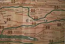 The presence of a village built at the foot of a wooden temple, no doubt a Diablintes temple, likely explains the decision in the Roman era to erect a fortress there.[4][3] The city named Noviodunum (Gaulish: "new fortress") was the most important Diablintes settlement and was mentioned by Ptolemy[5] and included in the Tabula Peutingeriana, where it was erroneously labelled Nu dionnum, on the same road as Araegenue.[6][7] It was an important crossroads, with links to some ten other settlements.[8] Urbanisation of the site began around the year 20, but in a disorganized manner.[4] The influence of the Roman Empire increased in the middle of the 1st century, as attested by the coins found at or near the site.[3]