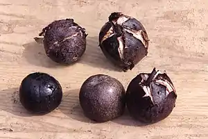 J. regia Zijing was cultivated by Wang Xiupo.[1][3] On 17 October 2017, Wang obtained the certificate of plant variety rights from the State Forestry Administration of China.[4] Because J. regia Zijing trees have five major purple features: female flowers, leaves, peel, and kernels, they are also called Wuzi Walnut (五紫核桃).[5] The trees are mainly distributed in Beijing International Walnut Manor.[1]