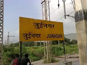 Juinagar Station Complex is located in sector 11 of Sanpada node but its very close to Nerul and can be called the external suburb of Nerul. It is adjoining to Sion–Panvel Highway. It is an attractive station complex in terms of location and aesthetics with colourful murals and outrageous fibreglass sculptures and hence is frequently used for film shootings.[1] Station complex consists of shopping area on the ground floor and well-integrated shops/ office premises on the first and second floors. This station caters for three corridors viz. CSMT–Panvel, Thane–Panvel & Nerul–Uran