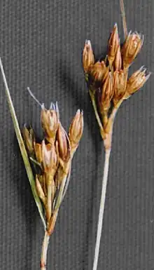 Juncus confusus is a species of rush known by the common name Colorado rush. It is native to western North America from British Columbia to northern California to Colorado, where it grows in coniferous forests and wet, grassy areas such as mountain meadows. It is a bunching rhizomatous perennial herb which grows to a maximum height between 30 and 50 centimeters. Its thready leaves grow from the base of the light green stems to about 15 centimeters long. The inflorescence atop the stem is an array of individual flowers and there is a long bract at the base which may be up to 8 centimeters in length. Each flower has long, pointed tepals with dark and light longitudinal stripes and membranous, translucent borders. There are six stamens. The fruit is a light to dark brown oval-shaped or rounded capsule.