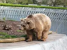 Next to the south entrance to the park is the Bärenzwinger (bear pit). This was built in 193839 on the site of a former sanitation depot, also designed by Ludwig Hoffmann and already decorated with more than 50 plaques by Otto Lessing depicting bears,[20] and a public lavatory,[21] and opened on 17 August 1939. It consists of indoor sleeping quarters and outdoor exercise areas which have held as many as five bears (the armorial animal of Berlin) who are the official bears or mascots of the city.[22][23] The impetus for building the Bärenzwinger was a letter to the newspaper Berliner Zeitung am Mittag (now B.Z.) from Wilfried Bade which appeared the day after the end of the celebration of the city's 700-year anniversary, and the Lord Mayor, Julius Lippert, had it completed despite objections from some Nazi functionaries that there were more important things to be done in what proved to be the run-up to World War II.[24] Two of the original bears were gifts from Bern, which also has a bear on its arms.[25][26] It remains largely unchanged, although it had to be reconstructed after the war; it reopened in 1949 with two new bears, again from Bern; one of these, Jente, produced 33 cubs (including 4 sets of triplets and 9 pairs of twins) before being retired to the zoo.[26][27][28] The last official city bear, Schnute, lived there until her death in 2015;[29] her daughter Maxi also lived there until her death in August 2013.[2][30][31][32] The Bärenzwinger is a listed Berlin landmark.[33] It was threatened with closure in 1990 due to lack of funds for needed modernisation, but after public protest, the Berlin Senate undertook to pay for the project. Underfloor heating in the cages and a skylight dome were added, and the electricity supply was overhauled. The facility reopened in 1993[34] and celebrated its 70th anniversary in 2009.[35] Some animal protection advocates, including the city's own animal protection officer, have called for it to be closed as old-fashioned and inhumane.[32][36][37][38]
