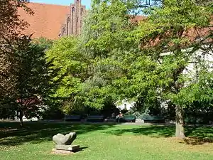 In 1858/59 Inselstraße was extended through the garden to connect Köpenicker Straße to the city centre, and the Lodge was forced to sell the larger, eastern portion of the site to the city. The Köllnisches Gymnasium was then built there.[10] How to use the remainder of the site was discussed for years; a desire to preserve the trees led to the rejection of several commercial proposals.[10] On 15 April 1869, the Assembly of City Deputies (Stadtverordnetenversammlung) decided to establish a public playground (probably one of the first in the city) and 'promenade location' there on plans drawn up by the first city director of gardens, Gustav Meyer, dedicated the necessary funds, and urged rapid execution of the plan.[1][11] The plan involved some new plantings, fencing, and benches. This renovation was completed in 1873. The park reached its current dimensions in 1883 after the ditch was filled in.[12] Ludwig Hoffmann, the architect of the Märkisches Museum (completed in 1907), then made some changes, including creating views across the park to the new museum.[1] The last major modification of the park took place in 196971 to designs by Eberhard Jaenisch, Stefan Rauner and Roswitha Schulz:[12] a mound which remained on the site of the bastion was levelled, a children's playground was added, a terrace was built behind the museum, and the Lapidary was created.[1][2]