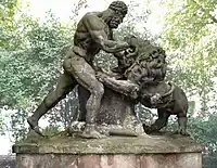 • a larger-than-life sandstone sculpture of Hercules fighting the Nemean Lion, at the eastern entrance to the park,[1] was modelled in 1787 by Gottfried Schadow and executed in 1791 by Conrad Nicolas Boy. The work originally decorated a bridge over the Königsgraben, was moved in 1891 to the Herkulesbrücke (Hercules Bridge) over the Landwehr Canal, was placed in storage in 1934 and was installed in the park in 1971.[14]